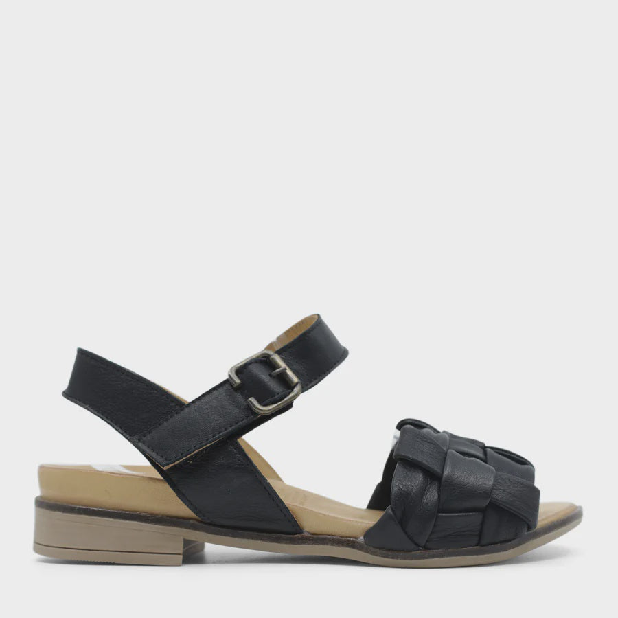 Goldie is an interwoven plaited leather front strap. A Velcro adjustable Y back with a decorative buckle. A full leather wrap footbed with metatarsal support.