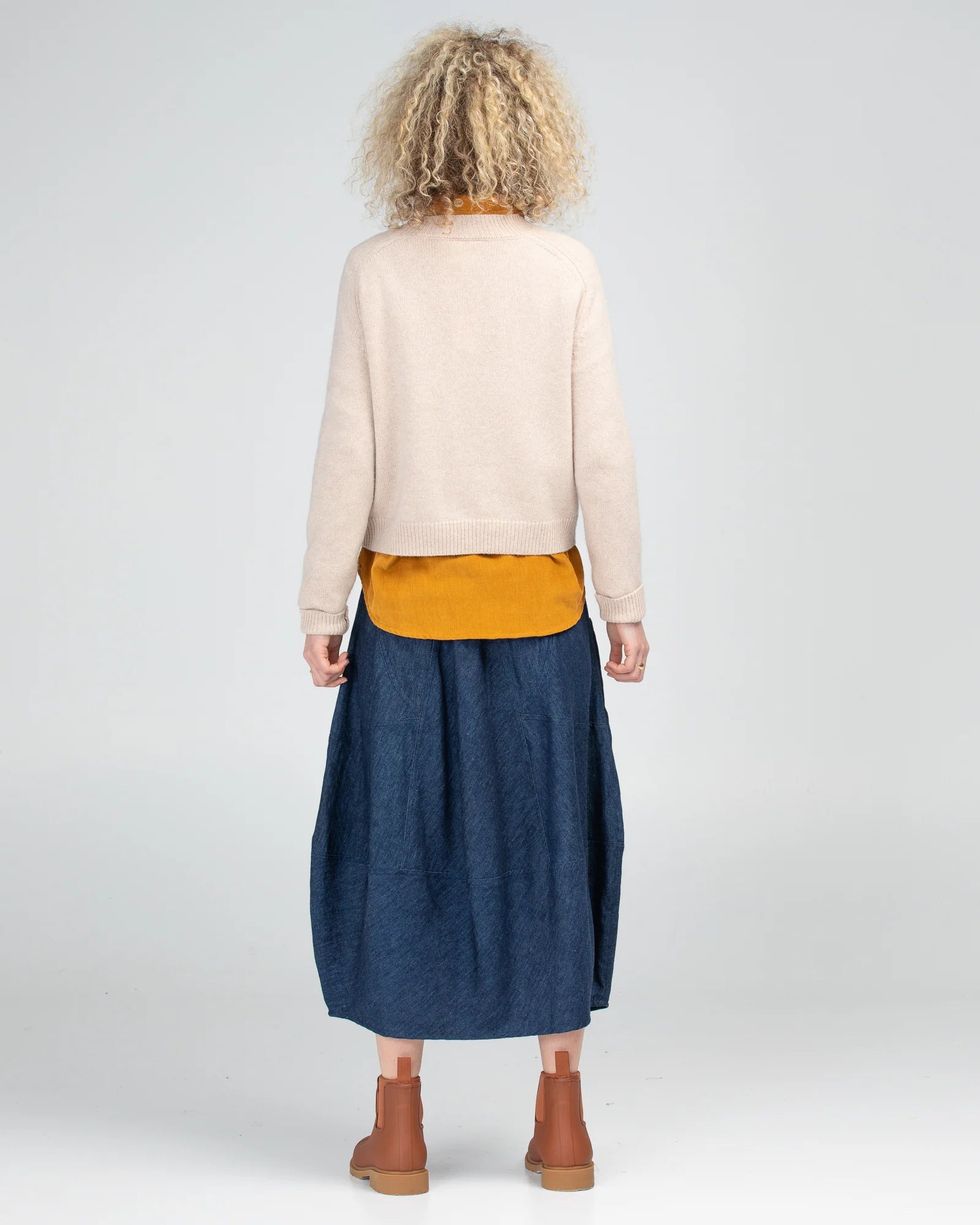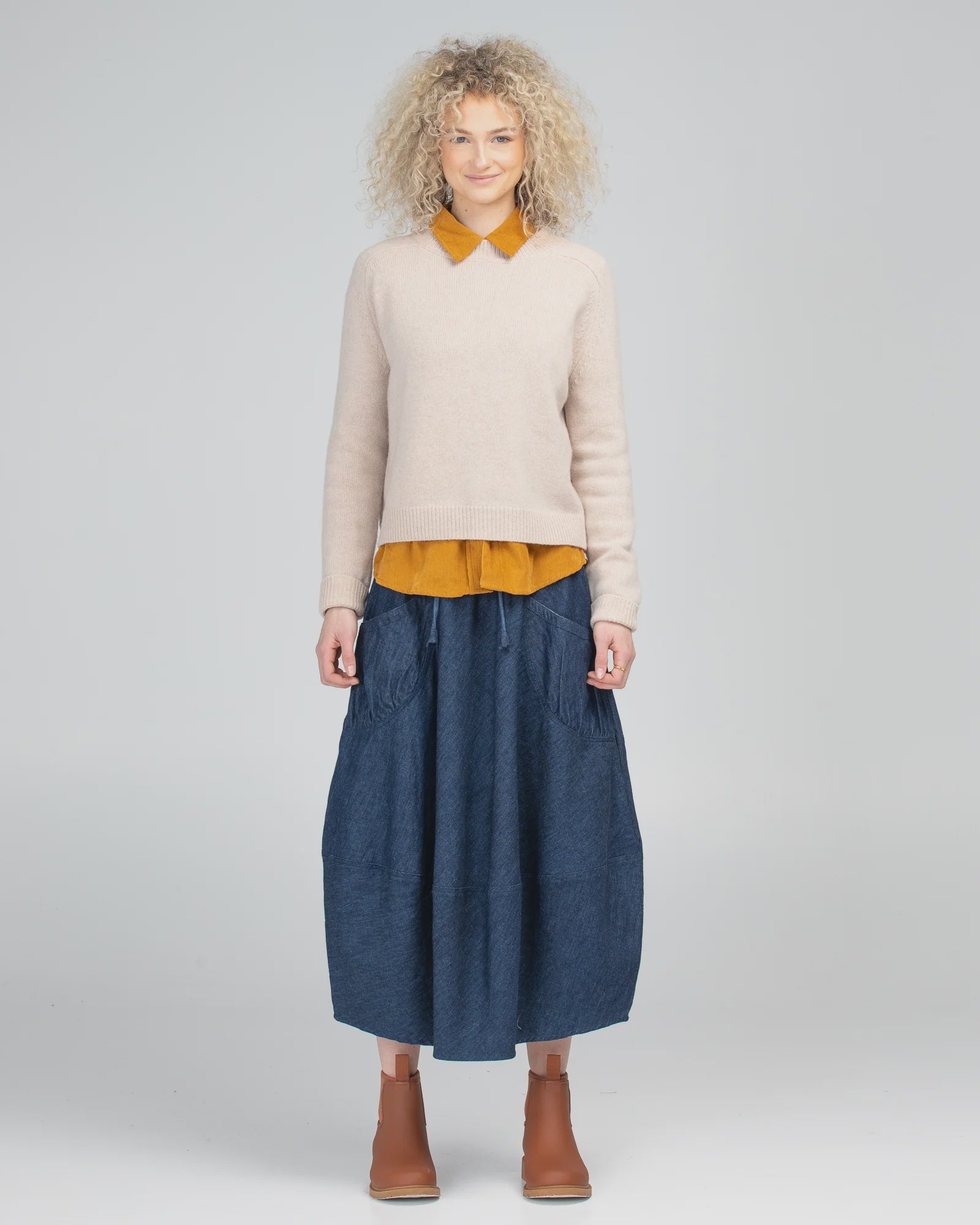 The Boom Shankar Guru Skirt is a winter weight 100% cotton skirt with a super comfortable stretch waistband and flattering shape. This skirt is made with a mid-weight denim and is a thicker fabric than our regular guru skirt material. This skirt can be worn from season to season. With two front and two back pockets, the Guru Skirt is a versatile and easy-to-wear option for all shapes and sizes.