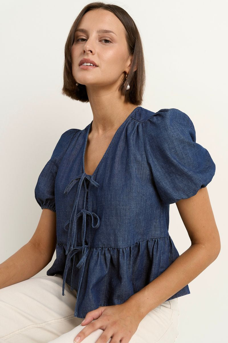 Restore Tie Front Peplum SS Top (Storm Blue Chambray)