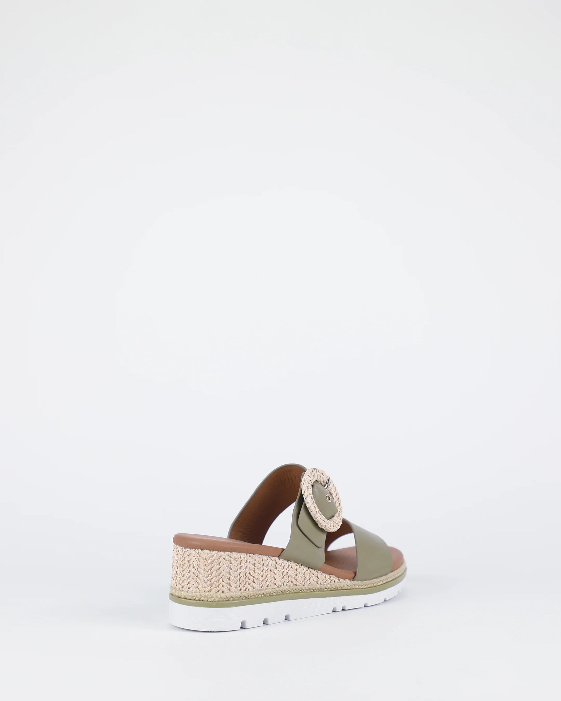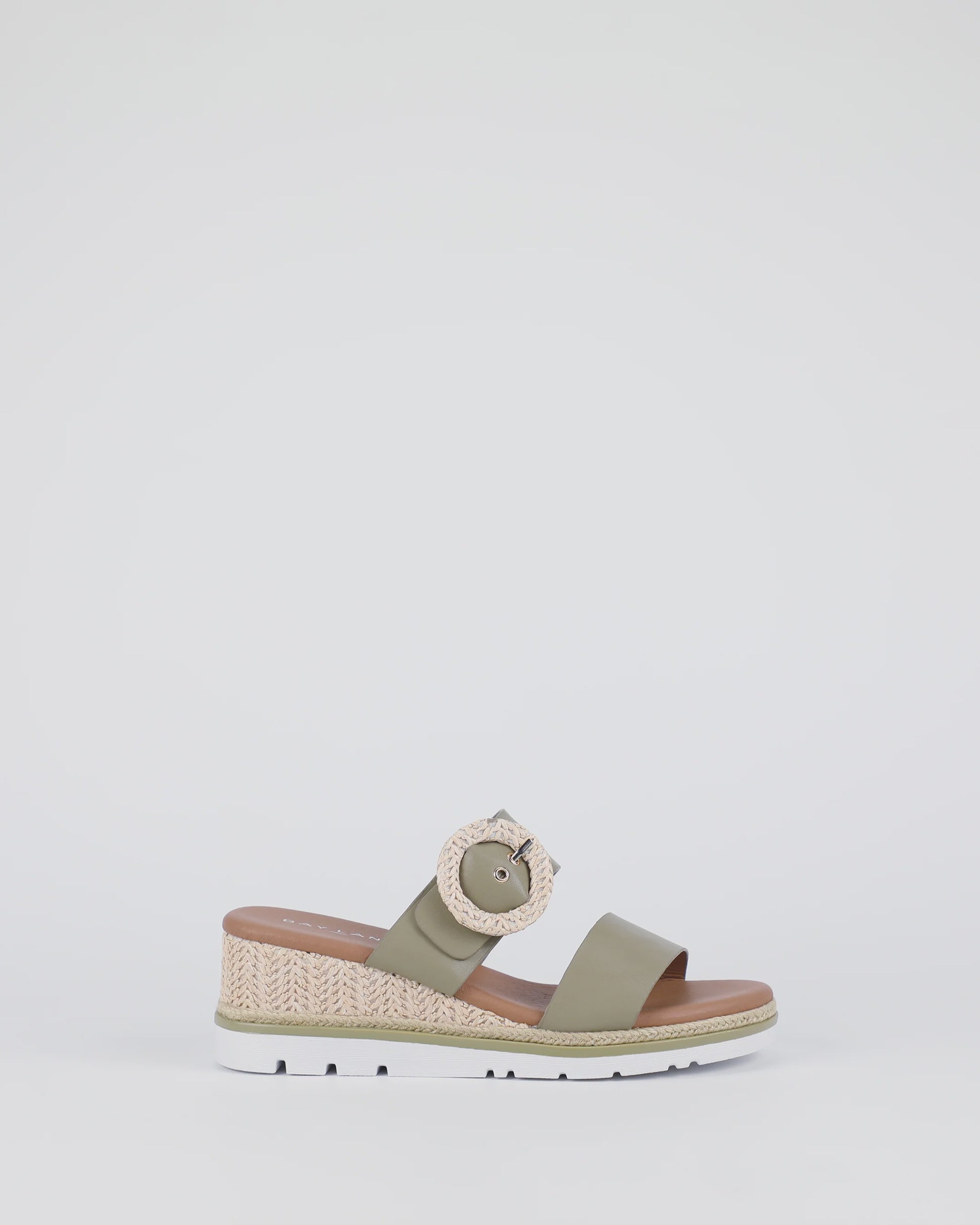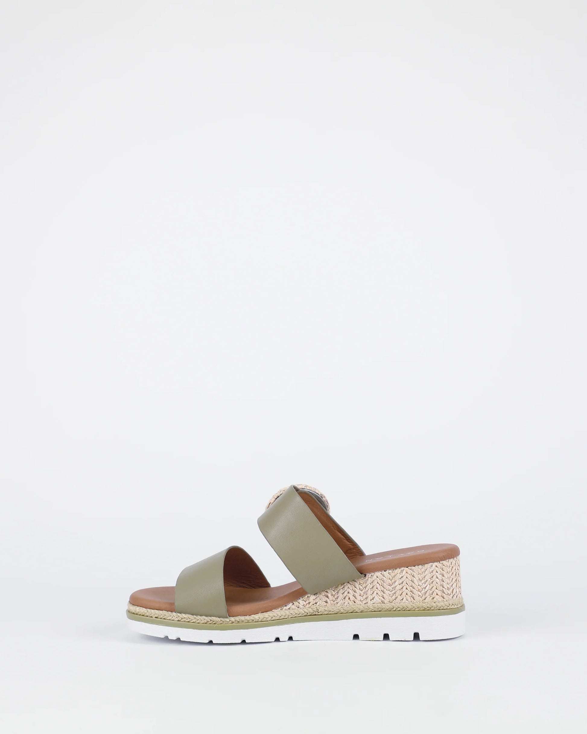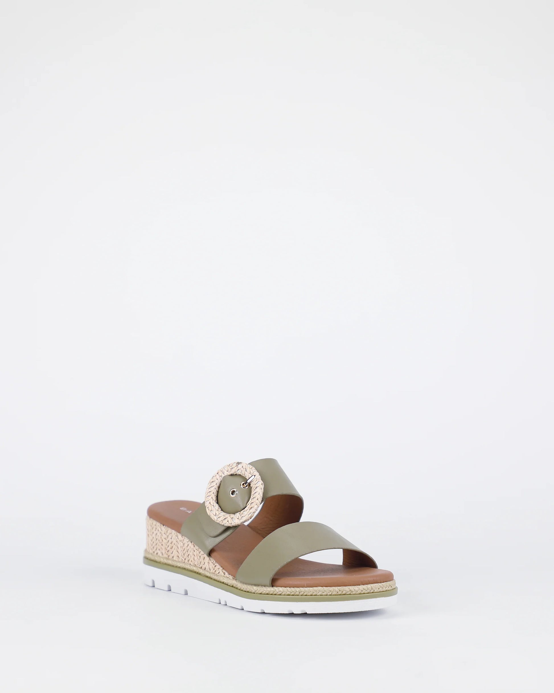 In sage, Riverton brings a fresh twist to warm-weather looks. Pair it with white cropped denim and a linen shirt for relaxed polish, flowing printed dresses for feminine charm, or wide-leg trousers in soft neutrals for a contemporary coastal feel. The slip-on design makes it easy to wear, while the bold buckle adds instant style.