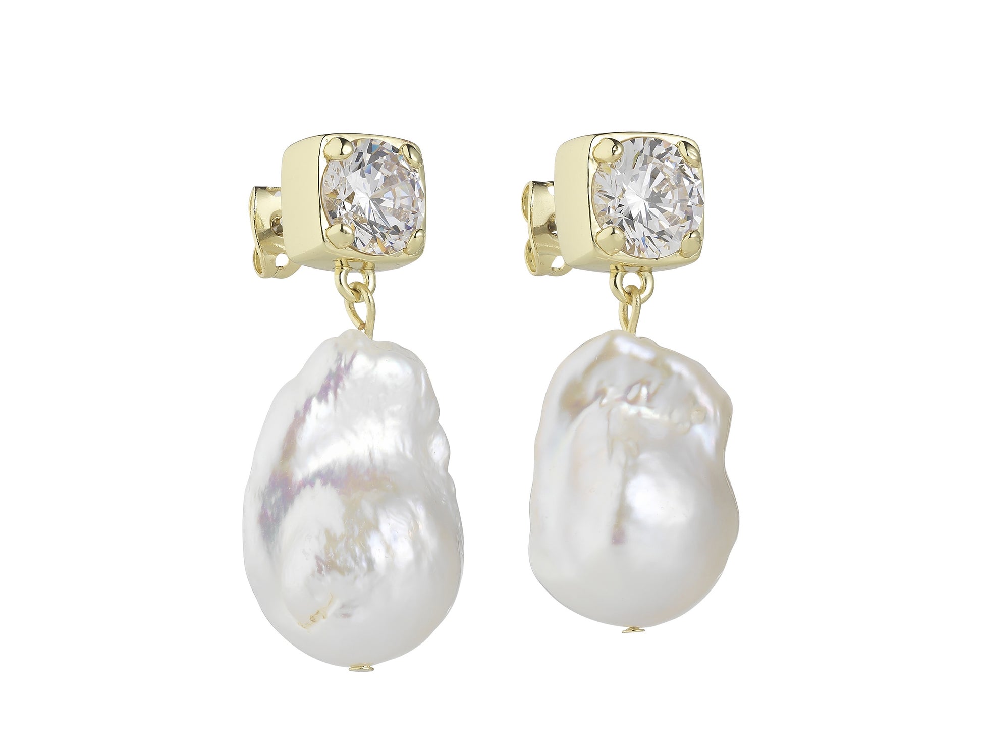 Glimmering square CZ set crystal studs with baroque fresh water pearl organic shaped drop