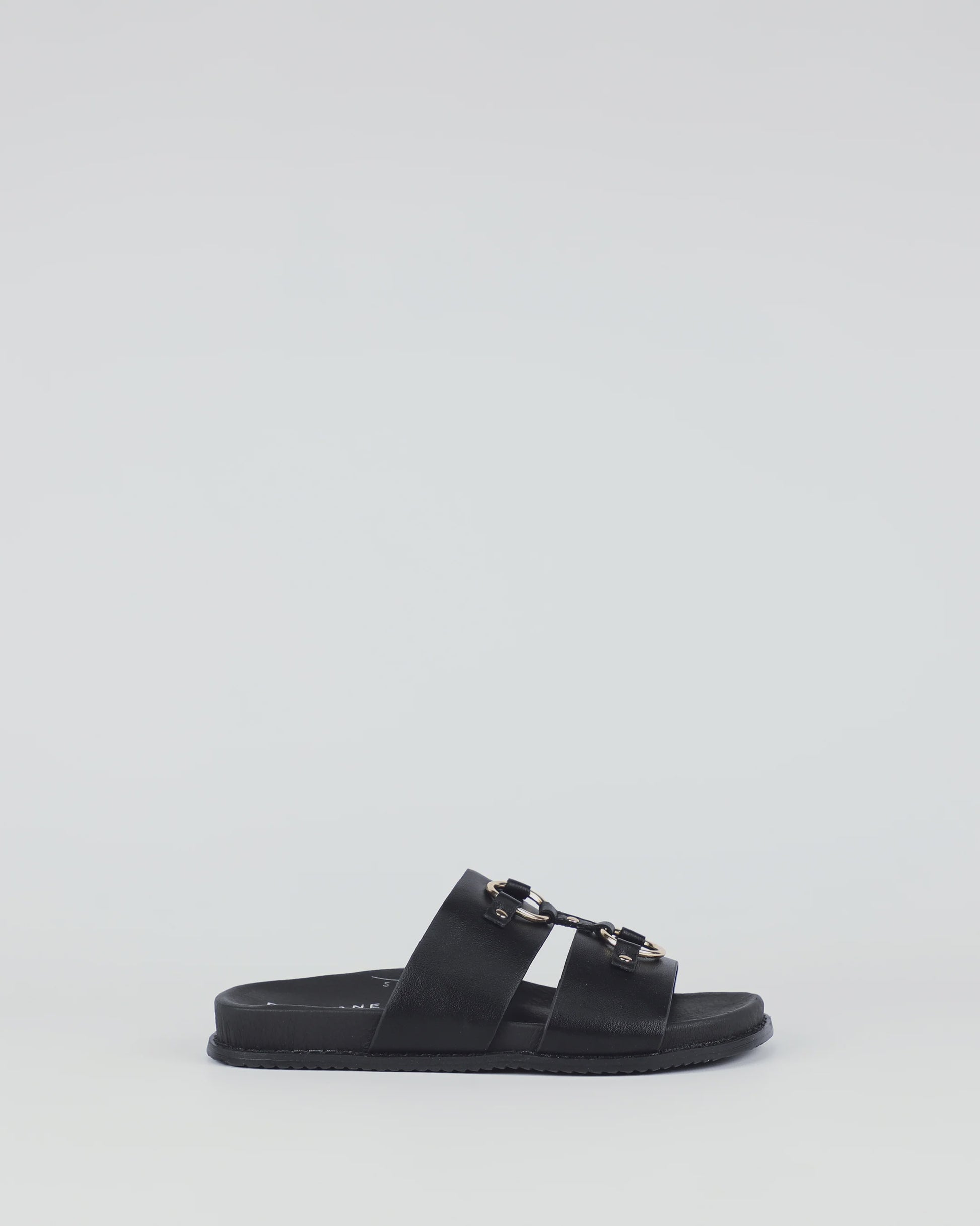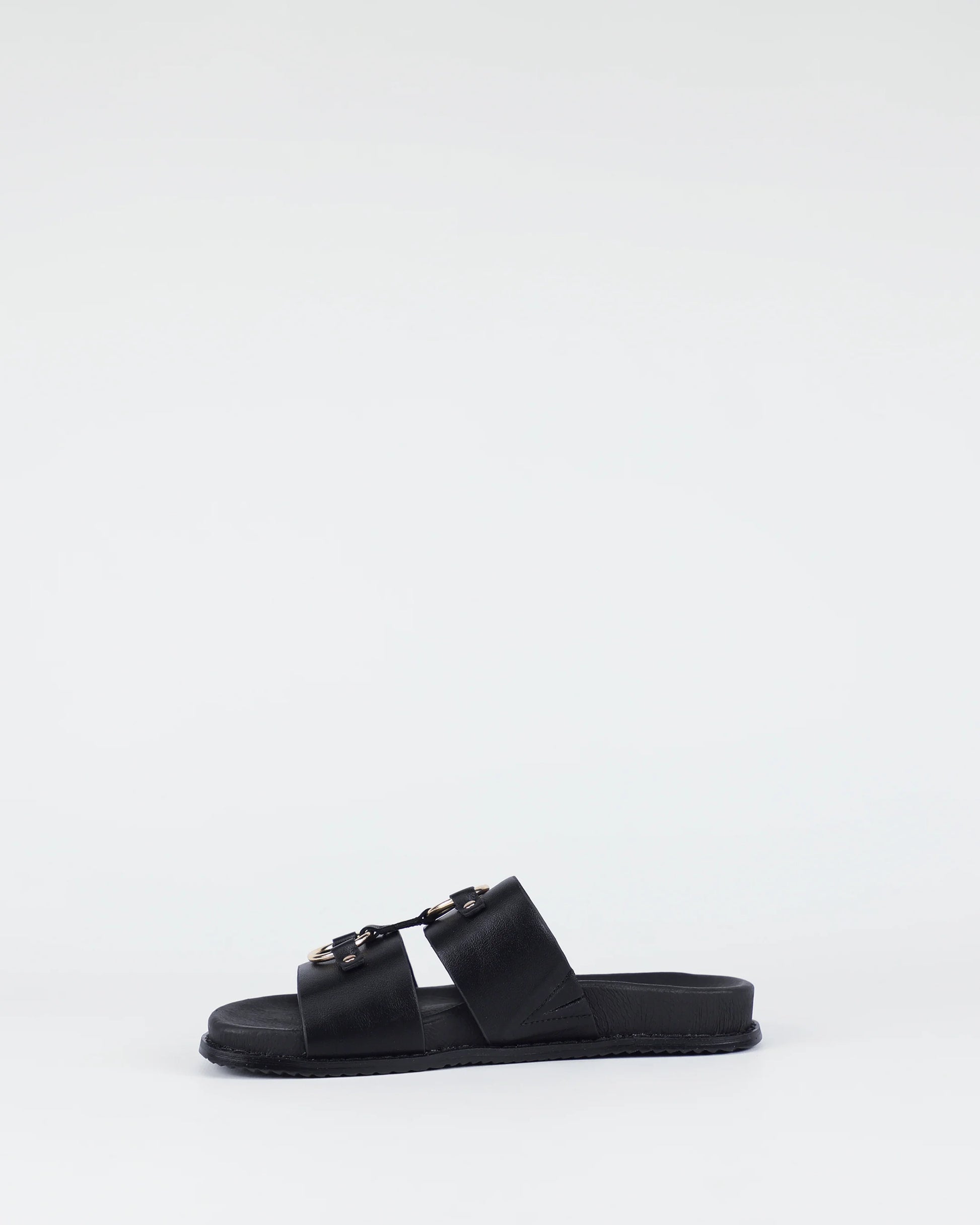 Step into modern ease with Zuma in black. Featuring wide double straps with polished gold hardware, this sandal delivers a sleek look with everyday versatility. The cushioned footbed and lightweight sole ensure comfort, making it a staple for warm-weather dressing.